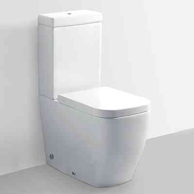A vitreous china, floor standing, close coupled, back to wall Water Closet suite with a wash down 4.5/3 litre dual flushing system. Features a horizontal outlet with two lateral holes for bottom water connection, and a cistern with water inlet from the bottom.
